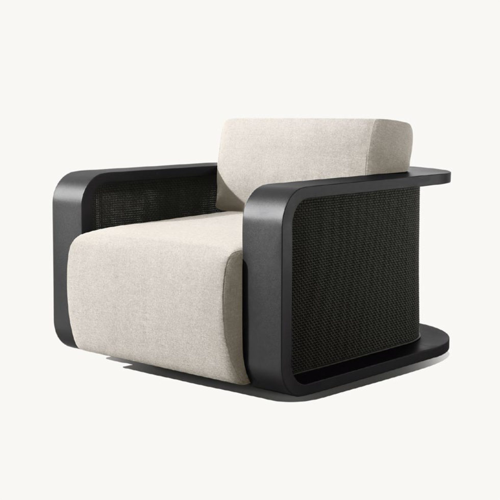 Generously padded seat and back cushions are made from high‑rebound foam and upholstered in a water‑repellent performance fabric, so you can relax in luxurious comfort through sun showers and summer heat. Wide arms flow seamlessly into integrated side ledges, providing space for drinks or decorative pieces. Hand‑woven UV‑resistant VIRO PE wicker accents soften the angular lines and add artisanal texture while remaining colourfast in harsh sunlight.